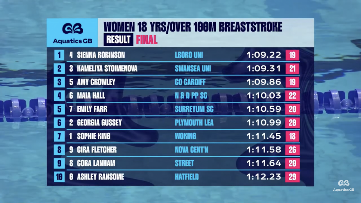 Sophie went into her last day of the competition with the 100 breaststroke swimming a 1:11.91. Managing to do enough to improve her entry ranking by a massive 9 places to make the final ranked 7th.