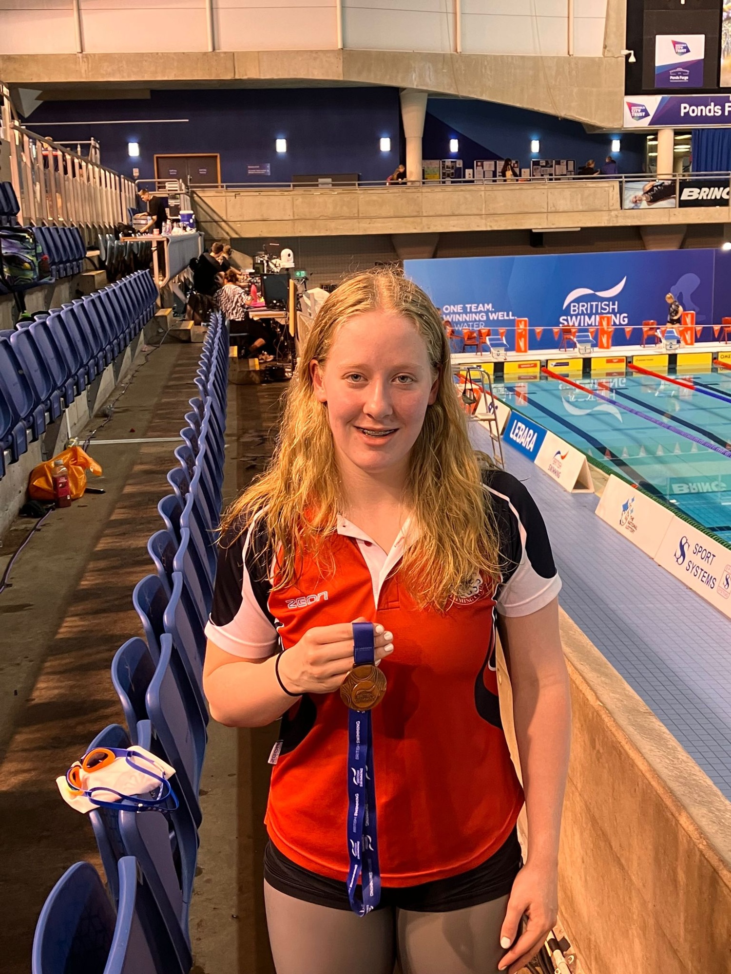 Sophie continued her program on day 2 with the 200 IM. A dominant fly and breast leg does enough to make the final ranked 7th(2.24.36). With the final come a few tactical alterations doing enough to go toe to toe for the bronze. She turns after an impressive breaststroke leg 4th 0.12 sec from third. They race down the pool fighting over position as Sophie triumphs to touch 0.03 sec ahead to take the Bronze, a personal best (PB) and a club record (CR) of 2.20.94.